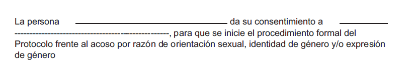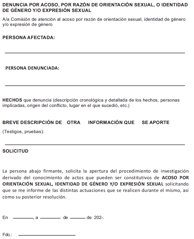 La persona denunciante puede presentar la queja o denuncia de forma verbal o escrita ante la comisión de atención al acoso por razón de orientación sexual, identidad de género y/o de expresión de género.