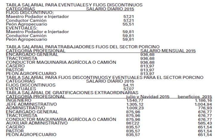 Los salarios que habrán de percibir los trabajadores agrícolas, tanto fijos, como fijos discontinuos y eventuales, en la provincia de Castellón, para el año 2015 serán los que configuran las Tablas Salariales Anexas.