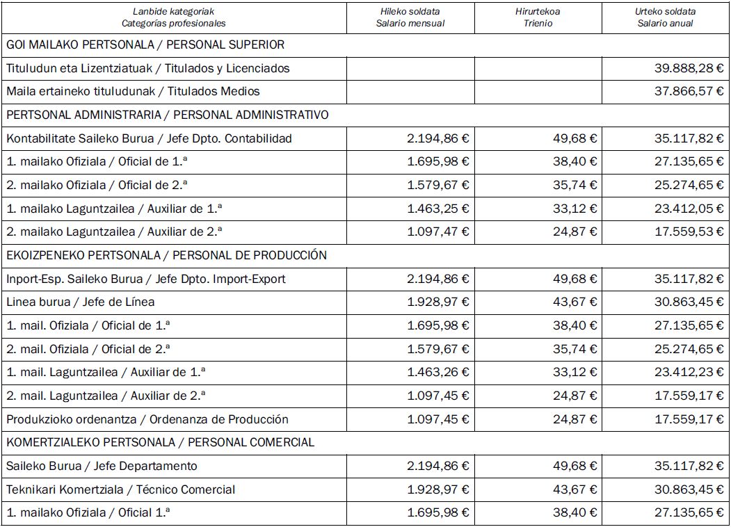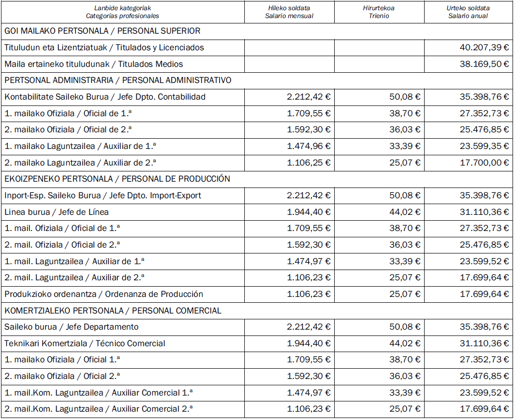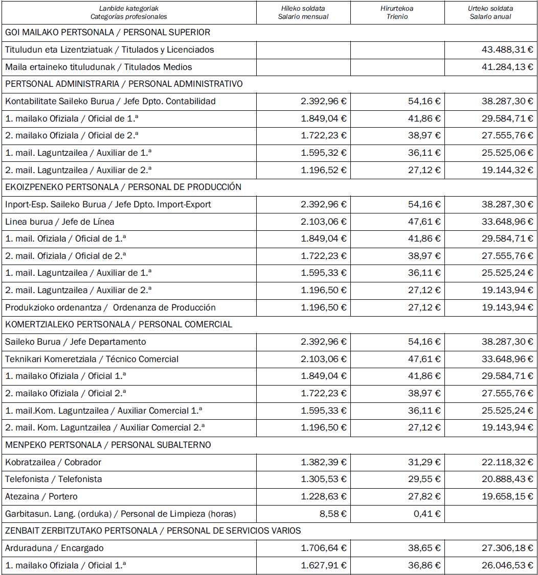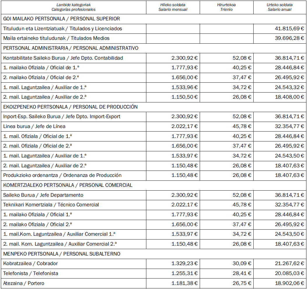 Los salarios mínimos que corresponde percibir a las y los trabajadores de las empresas Transitarias para los años 2019, 2020, 2021, 2022 y 2023 se recogen en los anexos I (2019), II (2020-2021), III (2022) y IV (2023) respectivamente, del presente Convenio y la tabla retributiva de los años 2024 y 2025 se establecerán por la Comisión mixta Interpretativa del convenio cuando se publique el dato del IPC de los años 2023 y 2024.