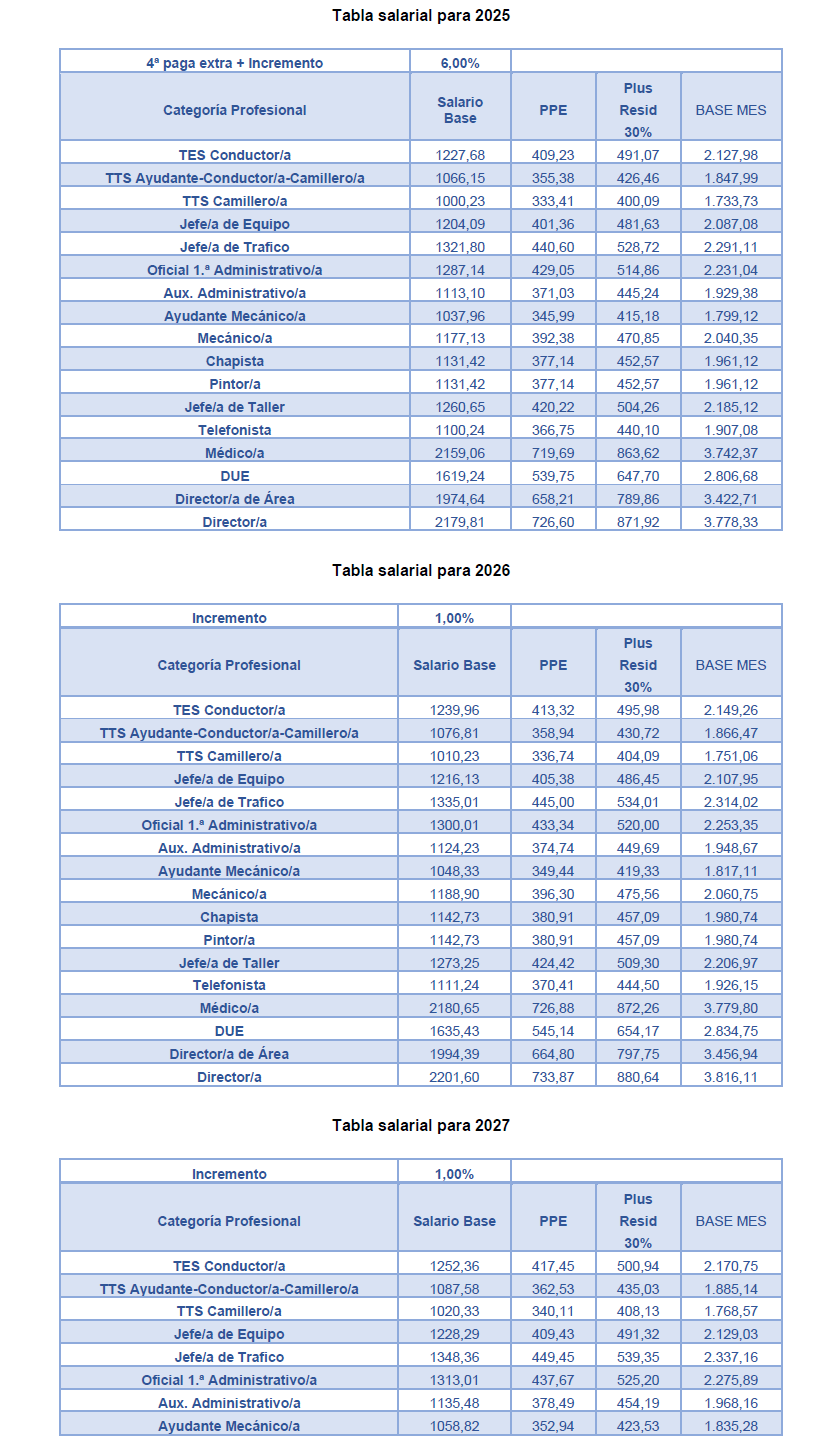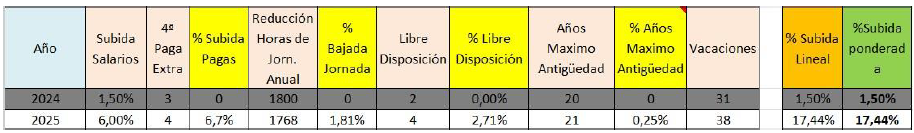se establece una subida sobre todos los conceptos retributivos generados en 2025 por cada persona trabajadora hasta el inicio del nuevo contrato del 17,44% en base a la siguiente tabla:
