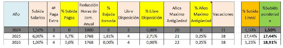 Dado la complicación del cálculo de la incidencia de los días de vacaciones dejados de disfrutar, y por el atraso en los pagos que supone el cobro por las personas trabajadoras al inicio del nuevo contrato, se suma un 1,5% para 2025 y otro 1,5% para 2026, quedando los porcentajes de la siguiente manera: