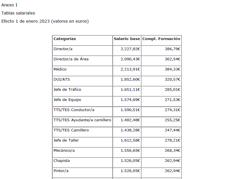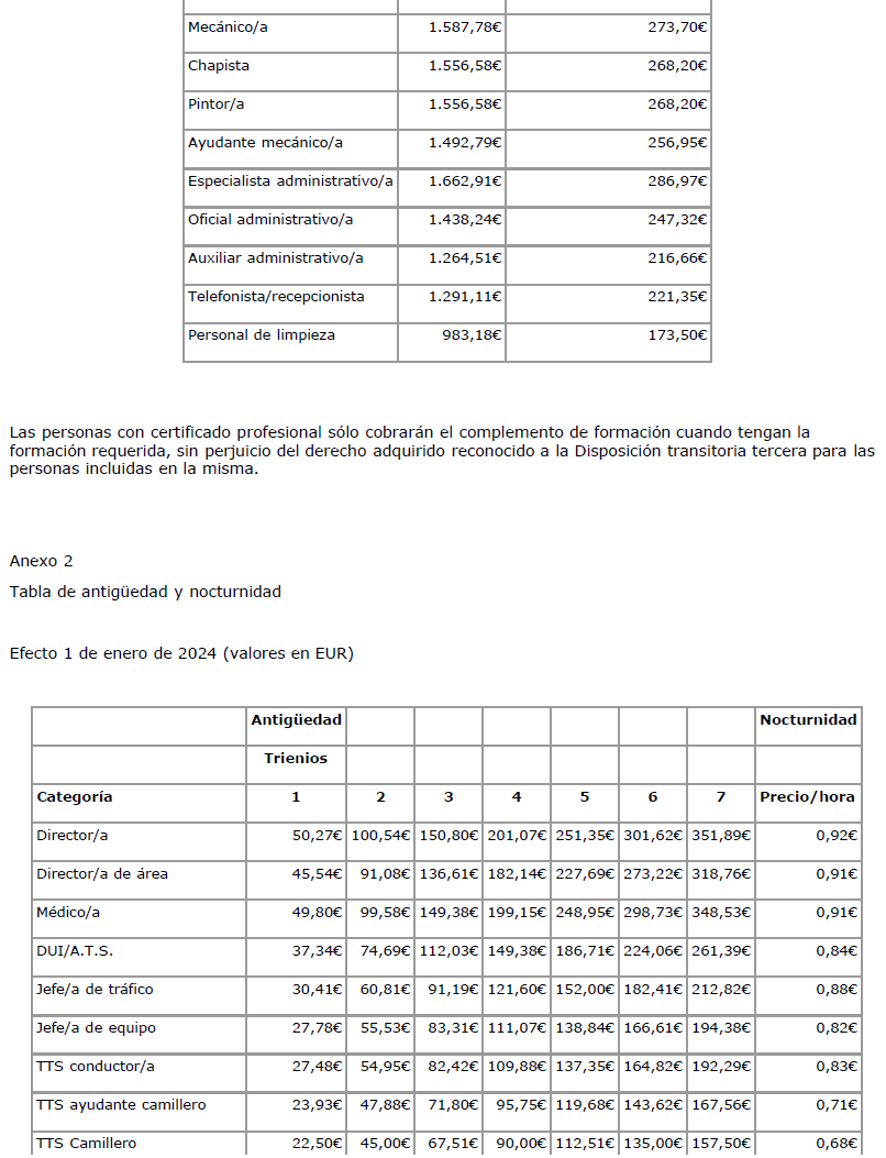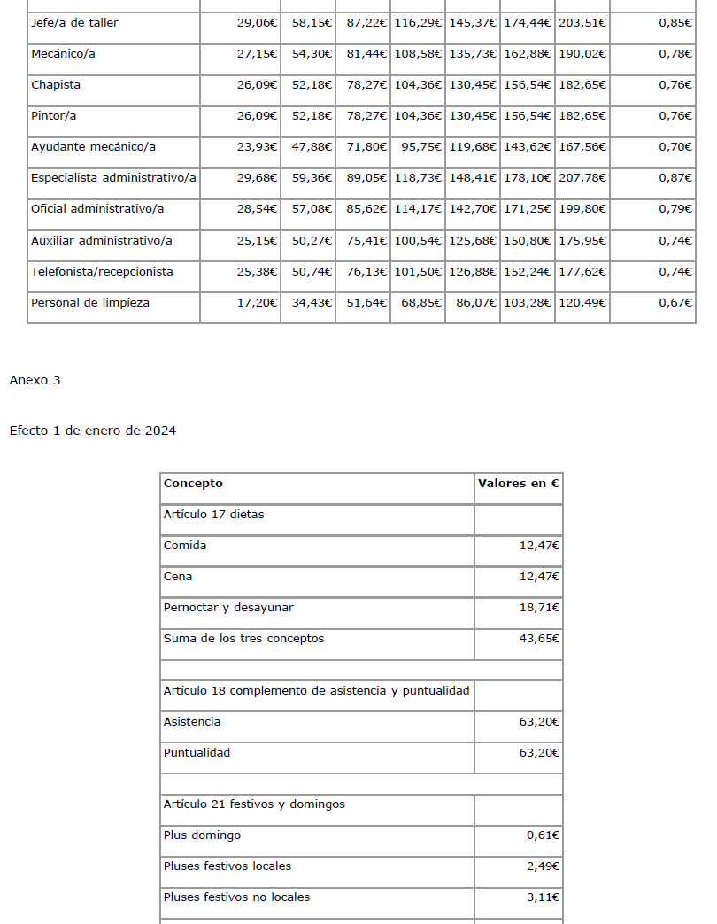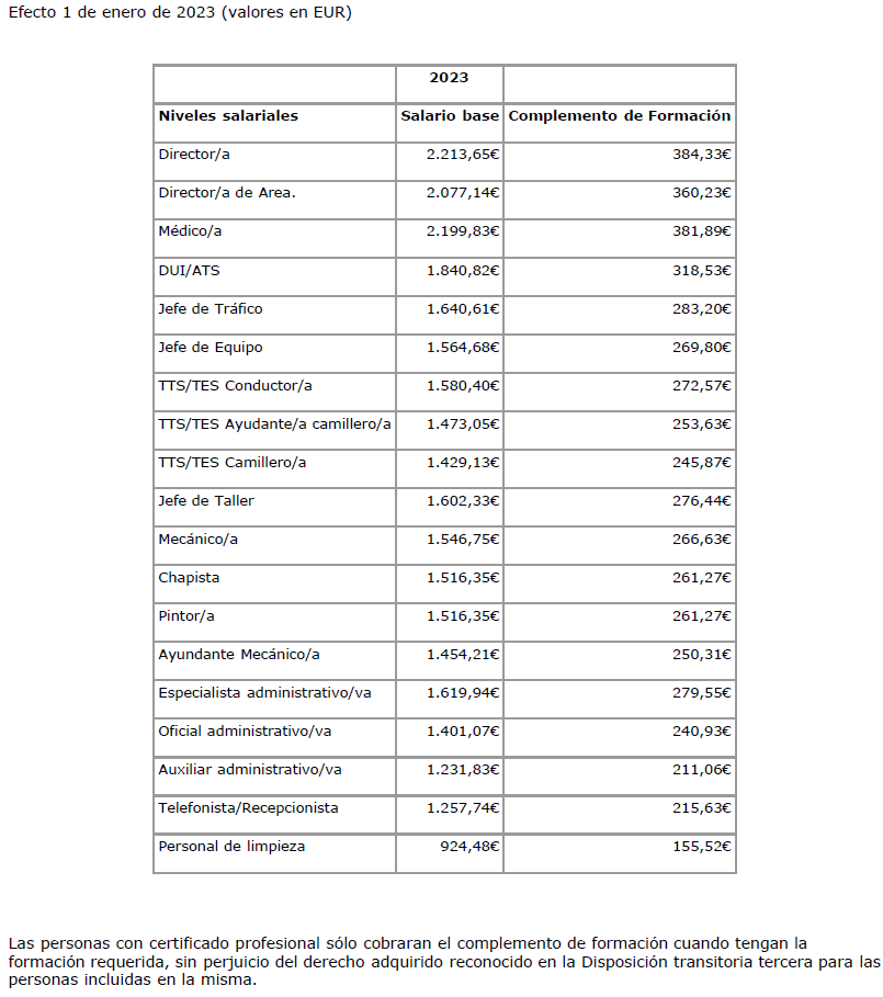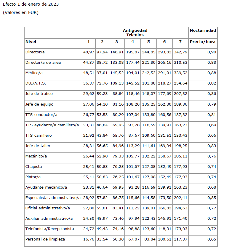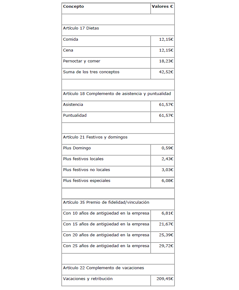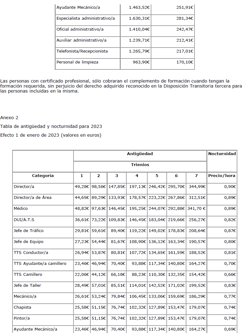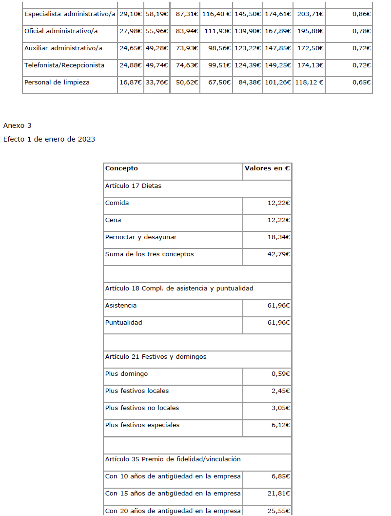 6.- En el Anexo del V Convenio colectivo, se contienen las Tablas Salariales con efectos de 1-1-2023, y en cuanto al Complemento de asistencia y puntualidad, se fijan los importes siguientes: