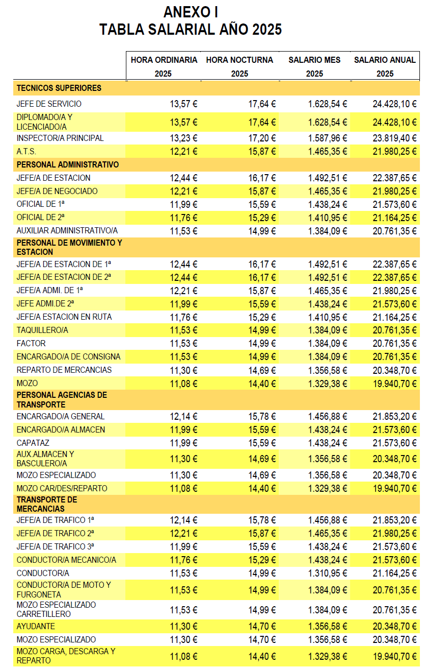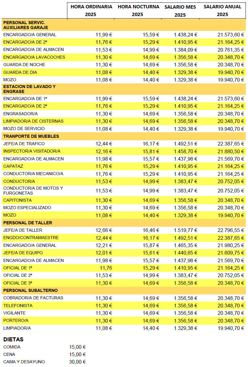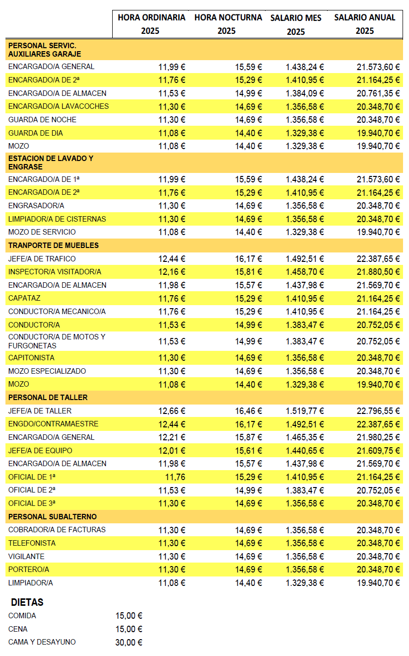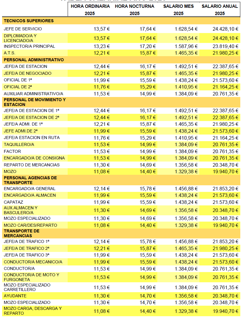 – en la tabla salarial para el año 2025 consta como salario base, en la categoría de conductor/a mecánico/a la cantidad de 1.438,24 € debiendo figurar 1.410,95 €.