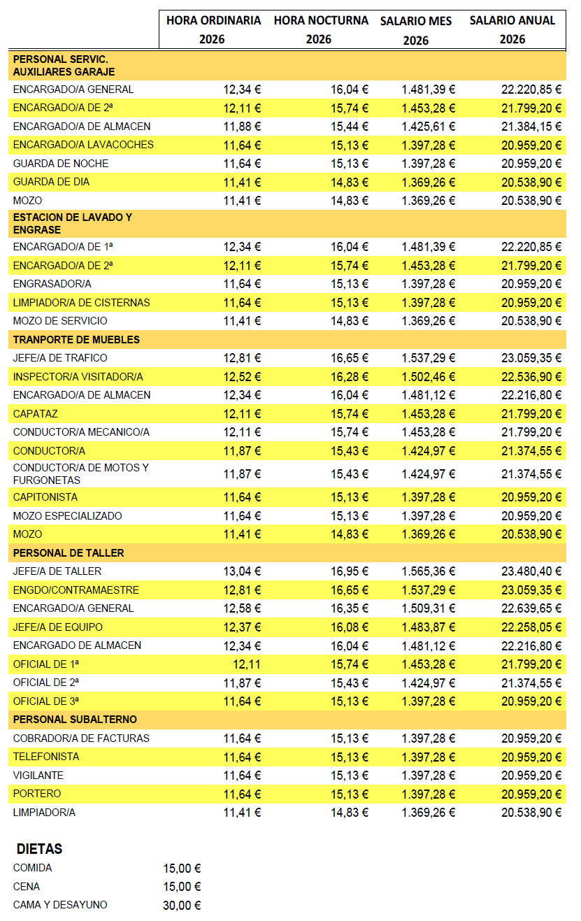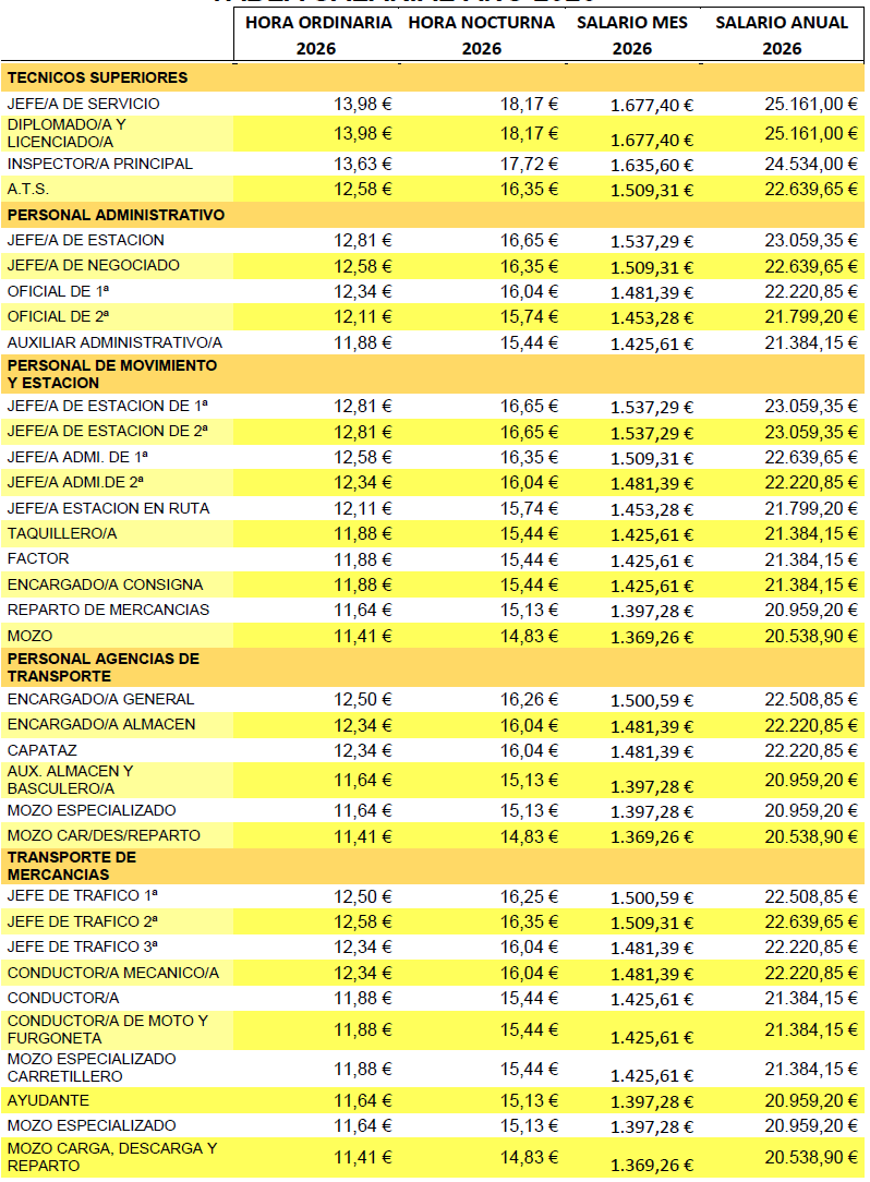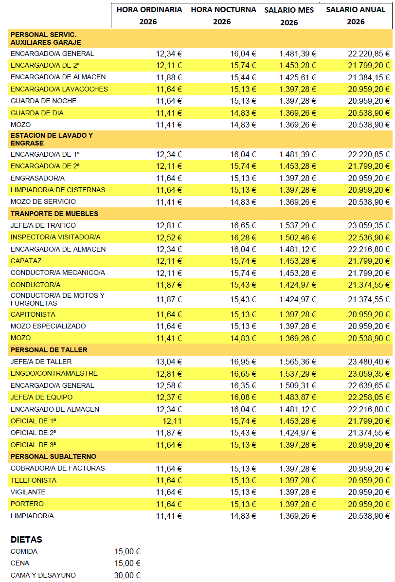 – consta para el año 2026 como salario base en la categoría de conductor/a mecánico/a la cantidad de 1.481,39 €; debiendo figurar 1453,28 €.
