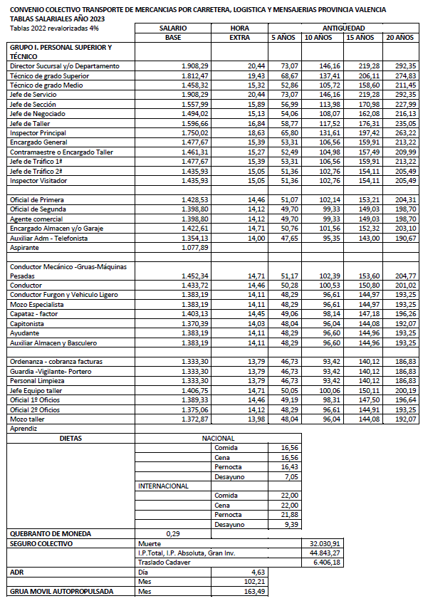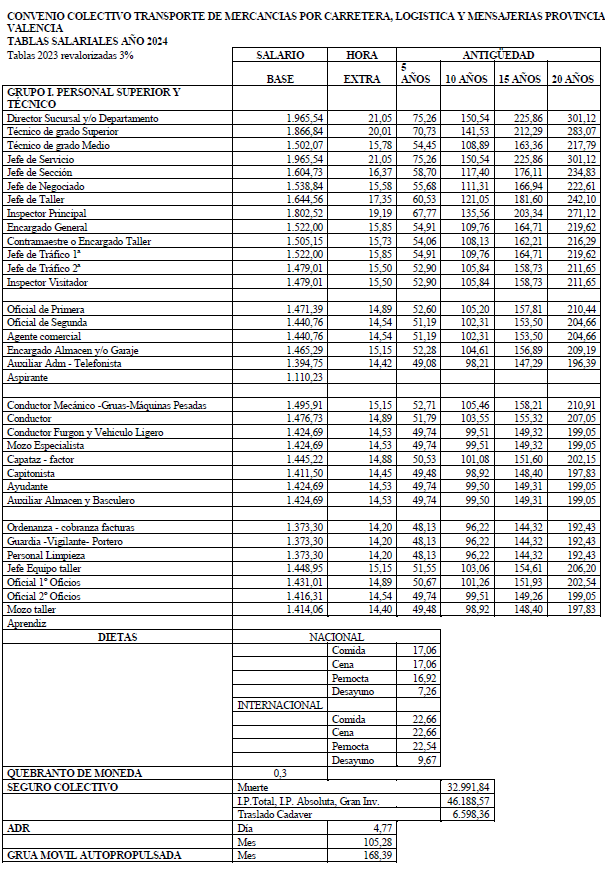Siendo las 12 horas del día 17 de enero de 2024 se reúnen en los locales de la Federación Valenciana de Empresarios del Transporte y la Logística (FVET), los componentes de la mesa negociadora del convenio colectivo para el sector del Transporte de Mercancías por Carretera, Logística y Mensajerías para la Provincia deValencia, que se reseñan a continuación al objeto de formalizar el presente Acuerdo Parcial alcanzado en el seno de la negociación sobre incremento salarial y tablas salariales 2024.