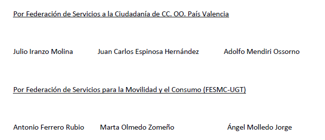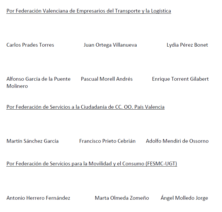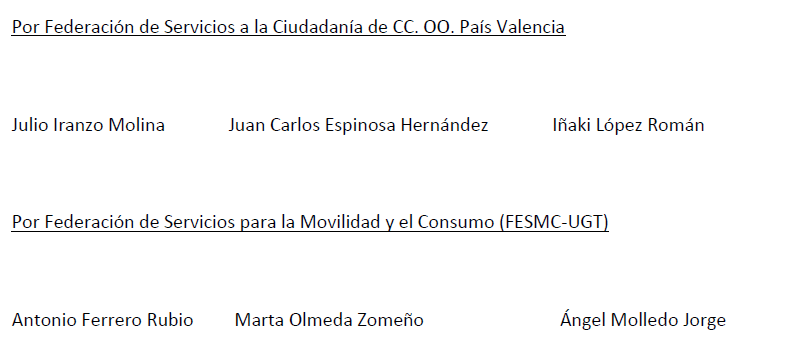 A los efectos del artículo 85.3.a del ET se hace constar expresamente que el presente Convenio se concierta por la Federación Valenciana de Empresarios del Transporte y la Logística (F.V.E.T.); por la Federación de Servicios para la Movilidad y el Consumo (FESMC-U.G.T.) País Valencià y por la Federación de Servicios a la Ciudadanía de CC.OO País Valencià.