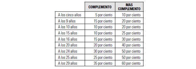 Los trabajadores/as comprendidos en el ámbito de aplicación de este convenio disfrutarán de un aumento periódico del 5 por ciento sobre el salario base por cada cinco años de servicio en la misma empresa, según la siguiente tabla: