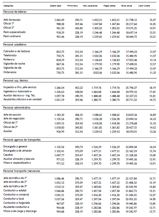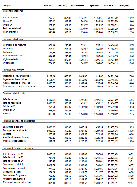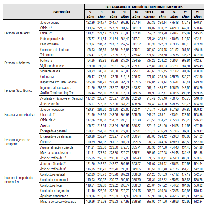 Complementos: antigüedad y complemento personal en su caso. Prima de rendimiento, horas extraordinarias, gratificaciones de julio y Navidad, participación de beneficios y, en su caso, renovación del ADR (Acuerdo Europeo sobre Transporte Internacional de Mercancías Peligrosas por Carretera).