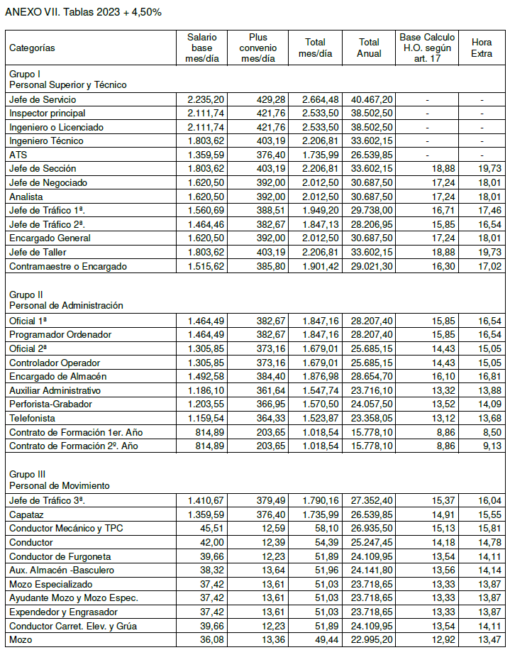 Las tablas salariales, en todos sus conceptos, se incrementarán respecto del año 2023, en un 4,5%, excepto la bolsa de vacaciones. Anexo VII.