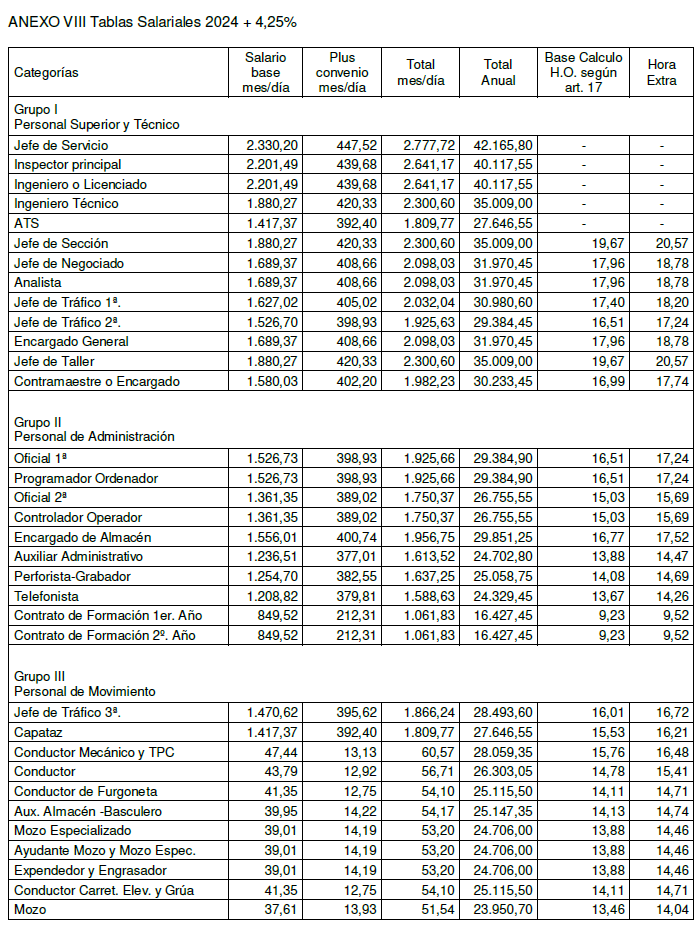 Las tablas salariales, en todos sus conceptos, se incrementarán respecto del año 2024, en un 4,25%, excepto la bolsa de vacaciones. Anexo VIII.