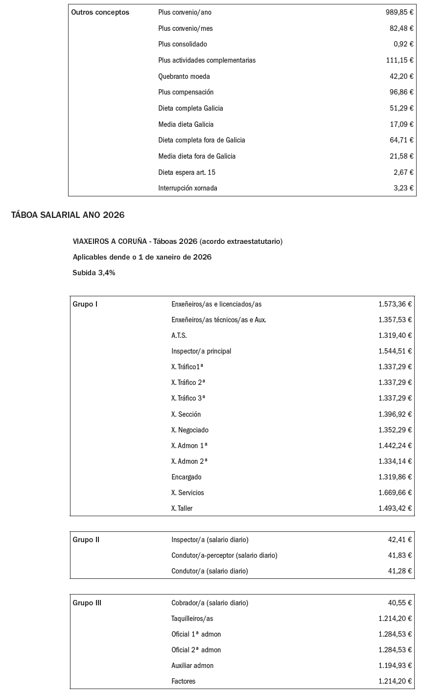 Para o ano 2026, aplicarase un incremento nas táboas salariais e todos os conceptos salariais e non salariais do 3,4%, con efectos a 1 de xaneiro de 2026. Si o IPC do ano superase o 3,4%, actualizaranse as táboas de 2026 con efectos de 1 de xaneiro de 2027 resultando así as táboas definitivas do ano 2026 sen xerar atrasos.