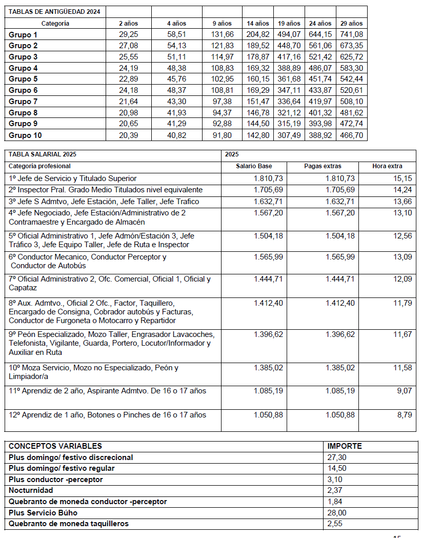 Todos los trabajadores afectados por el presente Convenio Colectivo percibirán tres pagas extraordinarias por un importe según tabla salarial ANEXO I, más la antigüedad, correspondiente a cada trabajador, según el art. 12.