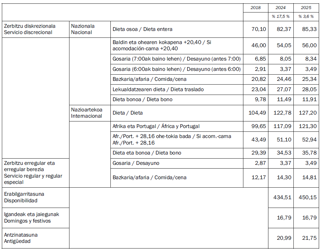 Por su parte, el artículo 15 «Dietas» también indica que todas las dietas recogidas en ese artículo tendrán un incremento para el año 2025 equivalente a la subida del IPC de Euskadi del año 2024.