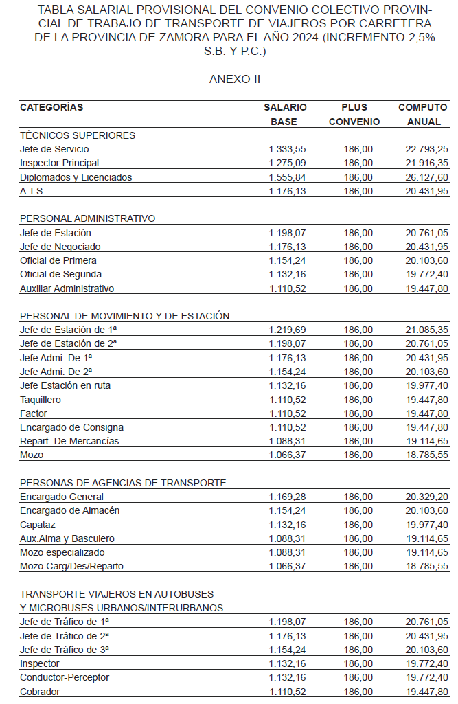 Visto el acuerdo de la Comisión Paritaria del Convenio Colectivo del Sector de Transporte de Viajeros por Carretera de la Provincia de Zamora, con Código de convenio 49005305011995, suscrito con fecha 20 de febrero de 2024, de una parte por CEOE*CEPYME ZAMORA, AZERBUS y ASEVIZA y de otra, por los sindicatos U.G.T. y CC.OO., a fin de revisar la tabla salarial del año 2023 y establecer el incremento salarial para el año 2024 según lo pactado en el artículo 14 del mencionado convenio y de conformidad con lo dispuesto en el artículo 90, apdos. 2 y 3 del Real Decreto Legislativo 2/2015, de 23 de octubre, por el que se aprueba el Texto Refundido de la Ley del Estatuto de los Trabajadores, Real Decreto 713/2010, de 28 de mayo, sobre registro y depósito de convenios y acuerdos colectivos de trabajo, Real Decreto 831/1995, de 30 de mayo, sobre traspaso de funciones y servicios de la Administración del Estado a la Comunidad Autónoma de Castilla y León en materia de trabajo y Orden PRE/813/2022, de 1 de julio, por la que se desarrolla la estructura orgánica y se definen las funciones de las Oficinas Territoriales de Trabajo, con relación a lo dispuesto en los artículos 1 y 2.3 del Decreto 1/2022, de 19 de abril de Reestructuración de Consejerías, del Presidente de la Junta de Castilla y León, esta Oficina Territorial de Trabajo resuelve:
