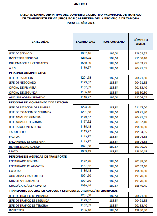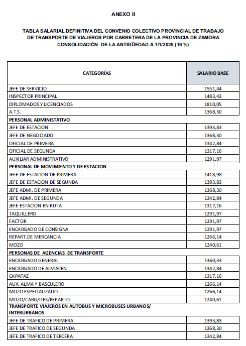 Resolución de 25 de abril de 2025, de la Jefe de la Oficina Territorial de Trabajo de la Delegación Territorial de la Junta de Castilla y León en Zamora, por la que se dispone el registro y la publicación del Acta de la Comisión Paritaria del Convenio Colectivo Provincial del Sector del Transporte de Viajeros por Carretera, en la que se acuerda la revisión de la tabla salarial del año 2024, así como establecer las tablas de consolidación de la antigüedad y las de incremento salarial para el año 2025. (Código del Acuerdo 49005305011995/ Localizador CP_FN37LG85).