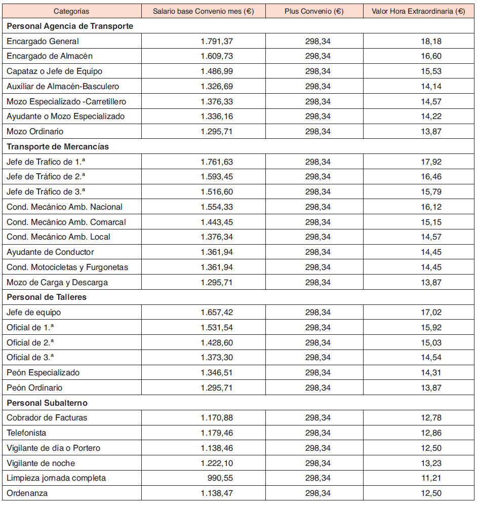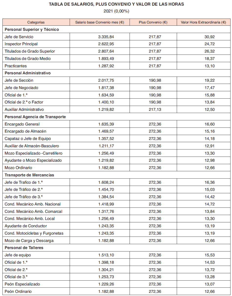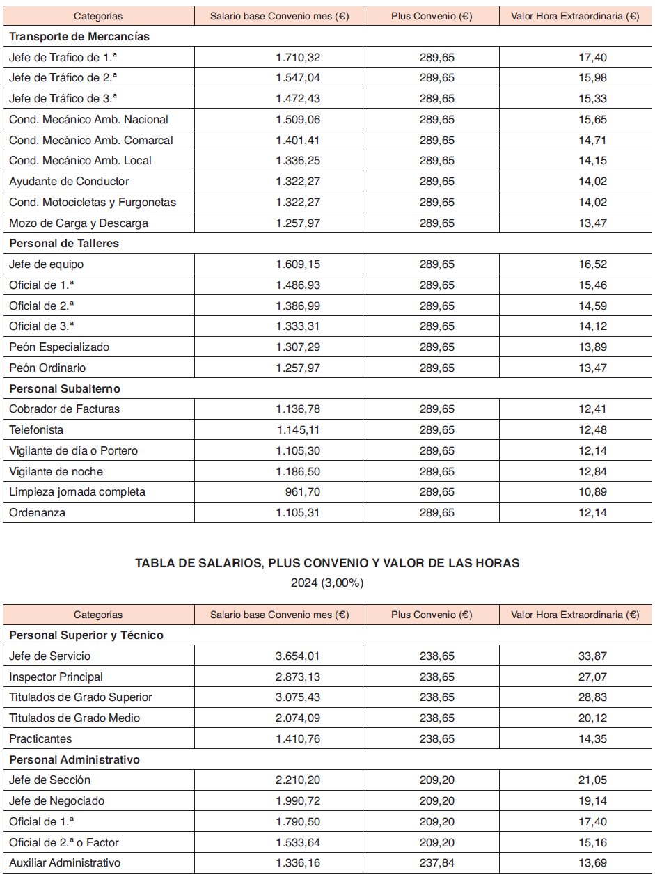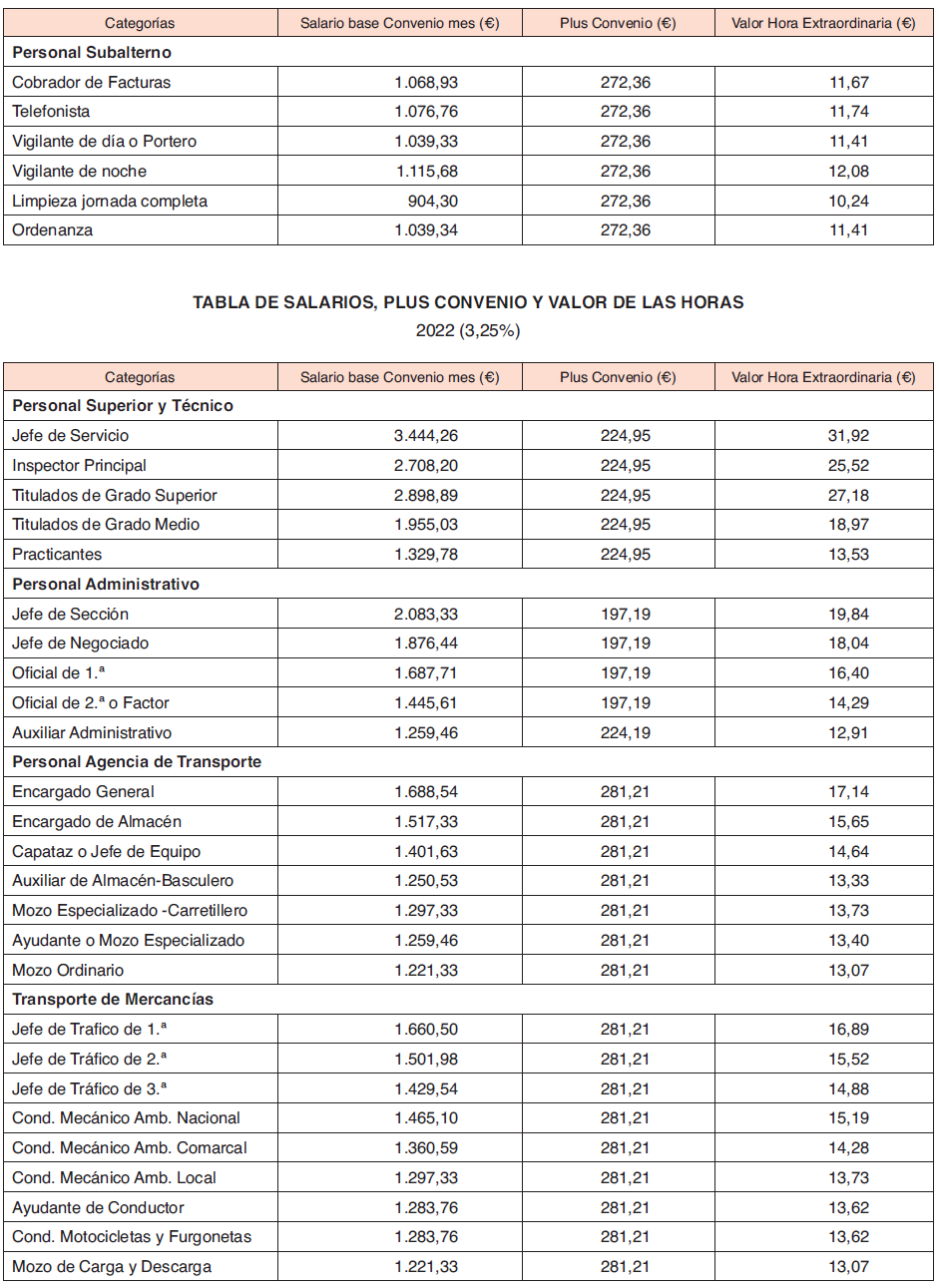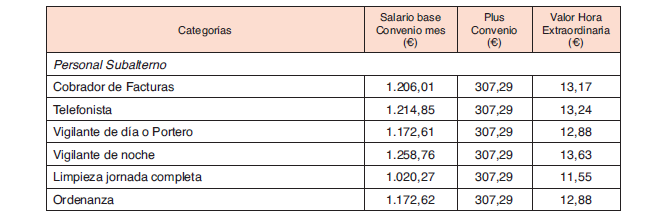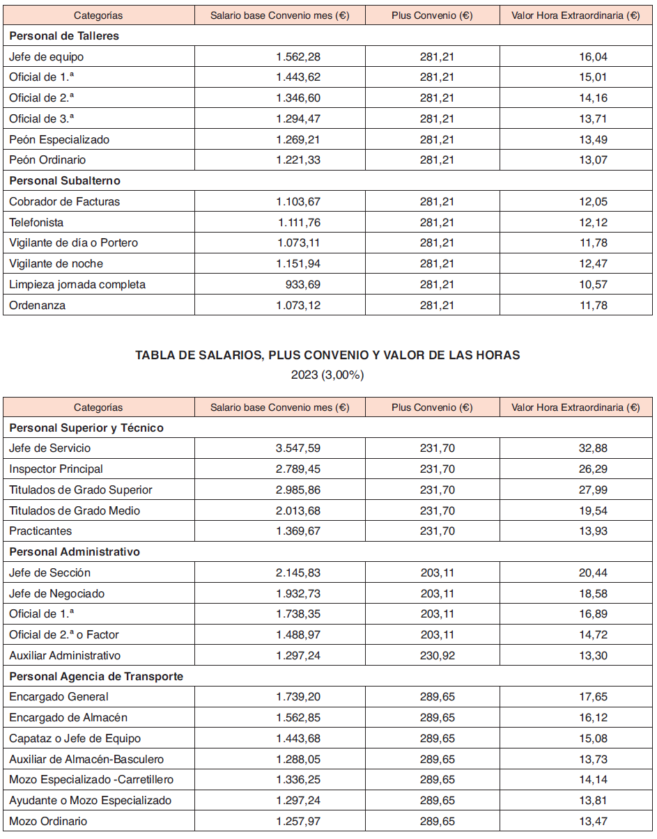 TABLAS DE SALARIOS, PLUS CONVENIO Y VALOR DE LAS HORAS.