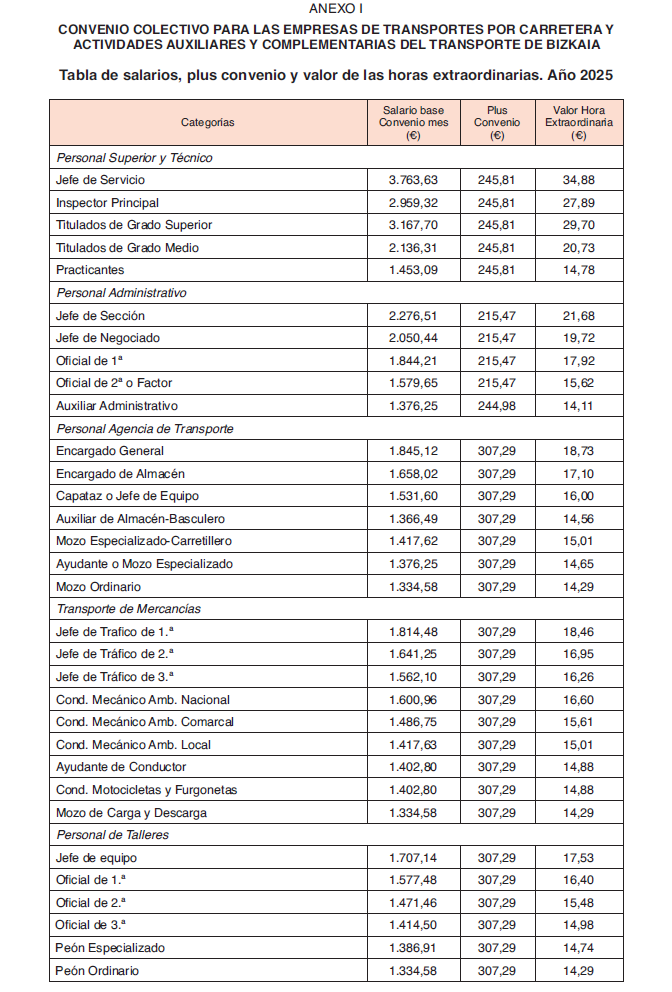 Resolución de la delegada territorial de Trabajo y Seguridad Social de Bizkaia del departamento de Trabajo y Empleo, por la que se dispone el registro, publicación y depósito del acuerdo de revisión salarial 2025 de la comisión paritaria del convenio colectivo para las empresas de transportes por carretera y actividades auxiliares y complementarias del transporte de Bizkaia (código de convenio 48002325011981).