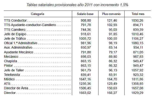 Por otra parte esta Comisión Mixta Paritaria procede igualmente a la aplicación del incremento pactado en el convenio colectivo para el año 2011, resultando la tabla salarial provisional para el año 2011, siendo aprobada por unanimidad y procediendo a la firma de esta, adjuntándola igualmente a esta acta para su publicación.