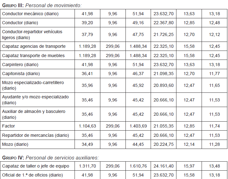 e) Entre las misiones que corresponde realizar a los mozos especializados figura la de manejar los aparatos elevadores y demás maquinaria auxiliar para la realización de las tareas de carga y descarga de vehículos en almacén, agencia o mudanza y el movimiento de mercancías en estos.