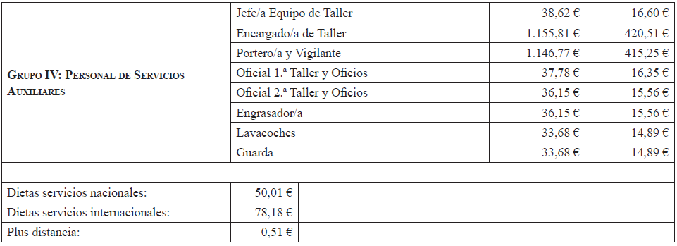Para el año 2024 y con efectos desde el 1 de enero, se establece un incremento del 4 % sobre todos los conceptos económicos para cada una de las categorías profesionales calculado sobre las tablas del año 2023, excepto para las dietas internacionales, cuyo incremento será del 0,5 %.