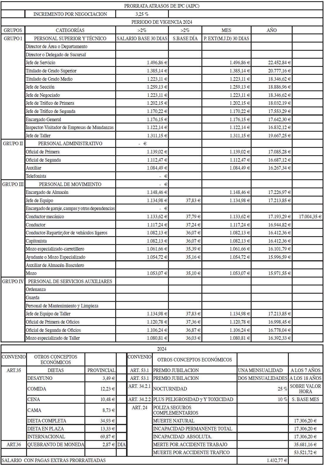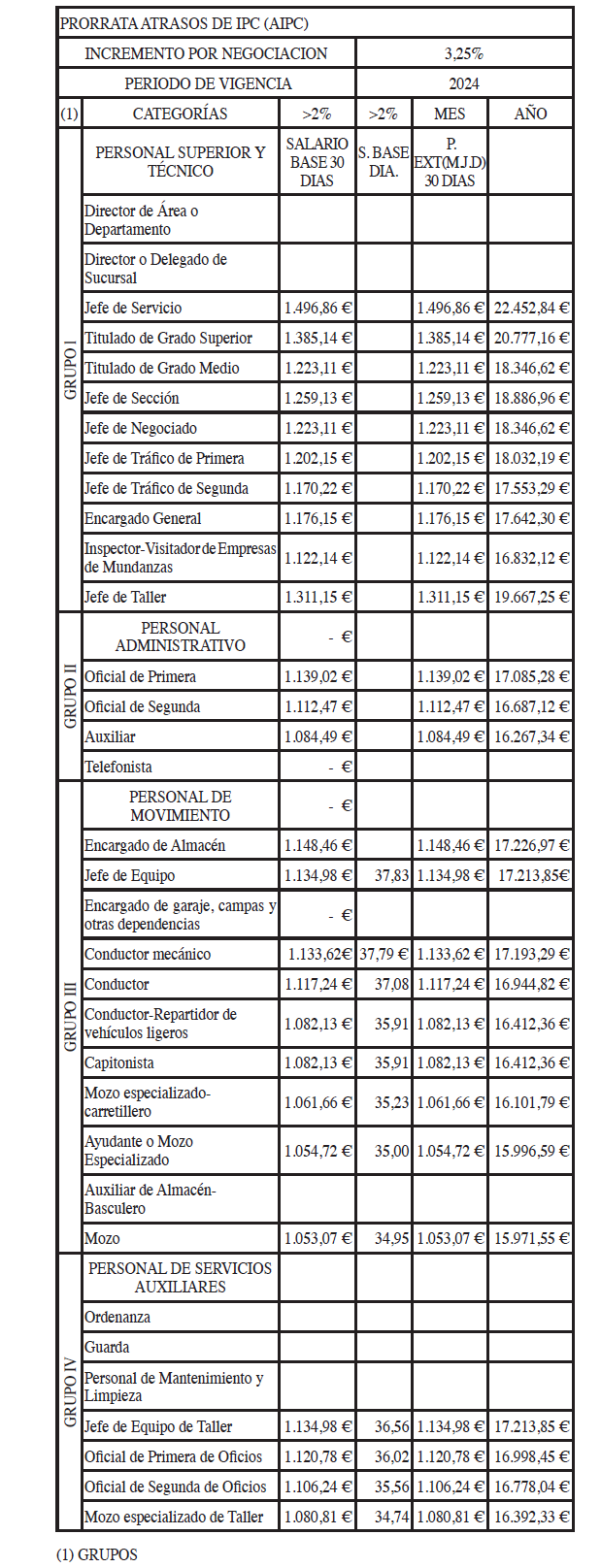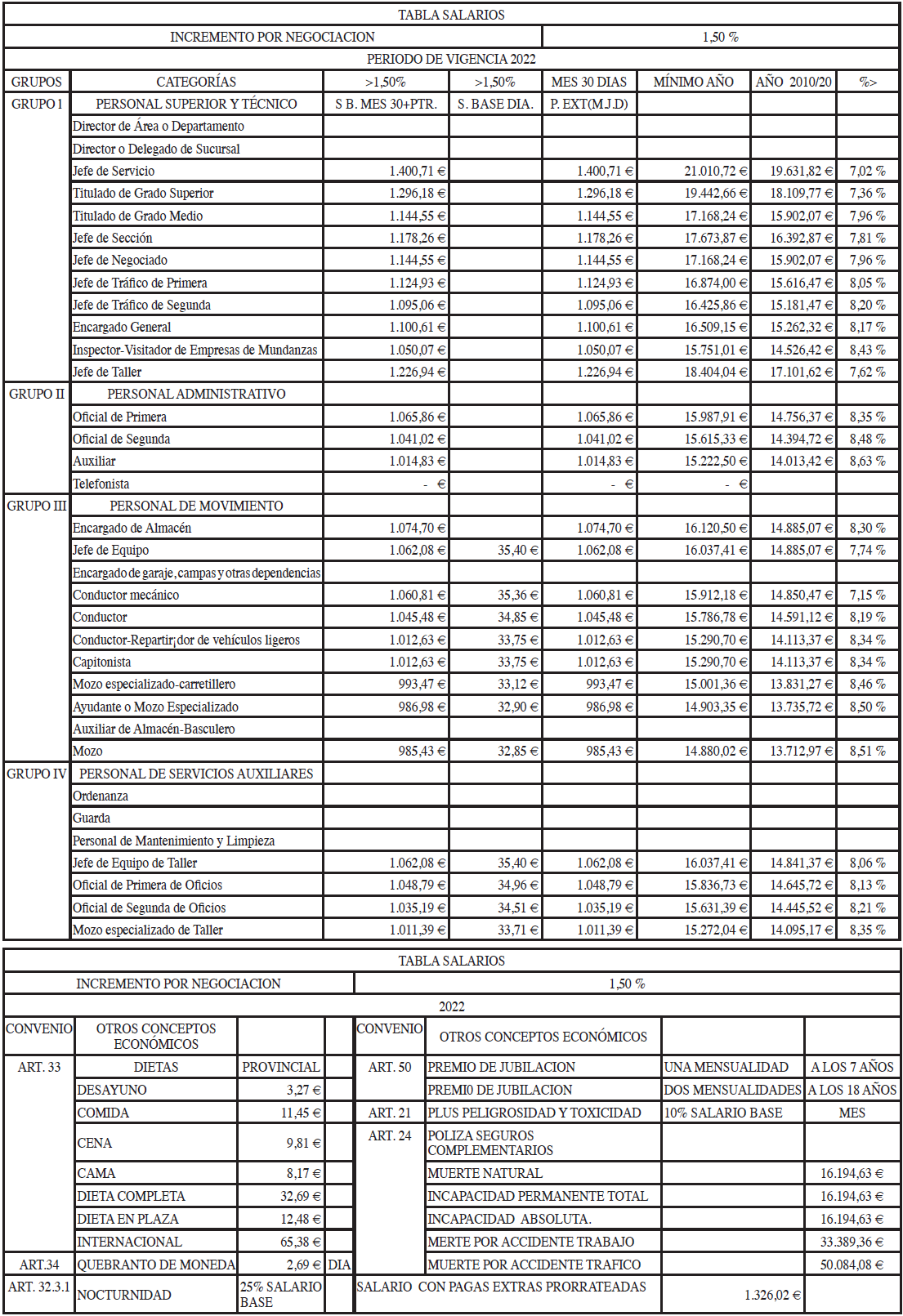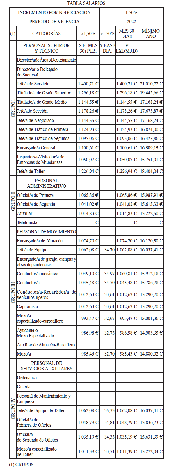 En el anuncio nº 62862 publicado en el boletín número 120 de fecha 24 de junio de 2022 se publicó en la Tabla salarial correspondiente al año 2022 y para la categoría de Conductor/a – Repartidor/a de vehículos ligeros el salario día 33,61.