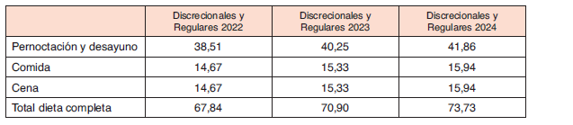 Las excursiones en día laborable devengarán en concepto de dieta, tanto para regulares como para discrecionales, la cantidad de 44,22 euros diarios en 2022, 46,21 euros diarios en 2023 y 48,06 euros diarios en 2024 aunque el trabajador pernocte en su domicilio, y en caso de pernoctar fuera de él se le adicionará la cantidad que corresponda por este concepto