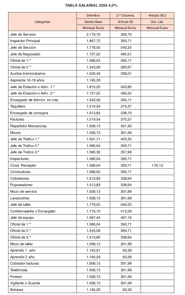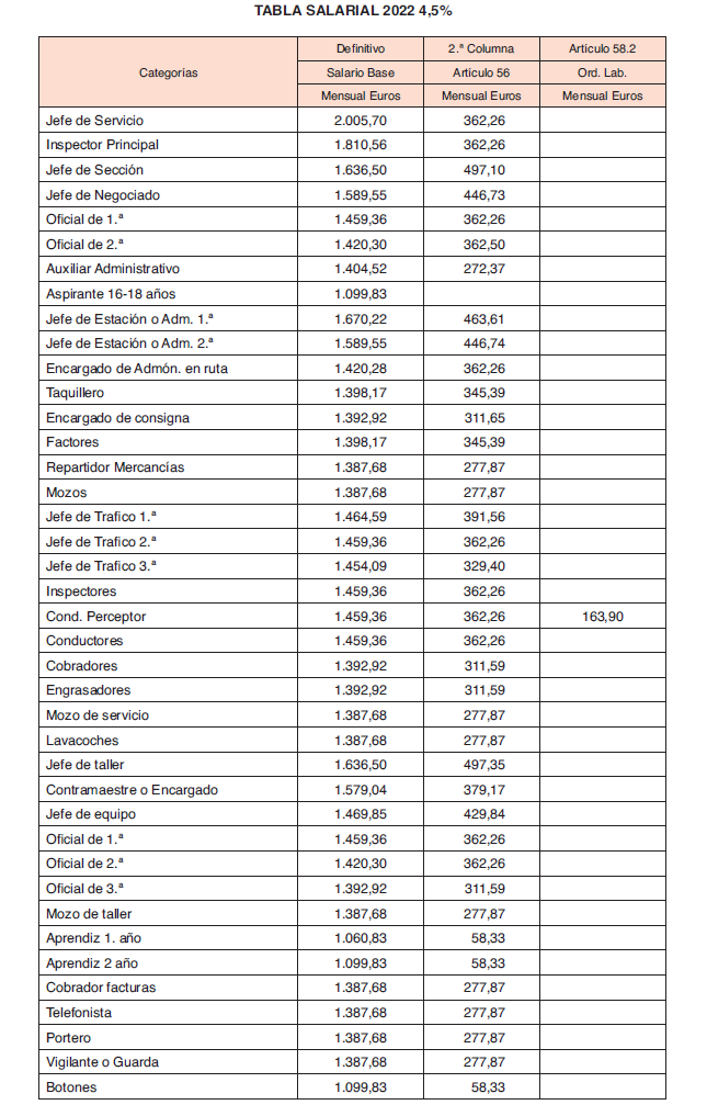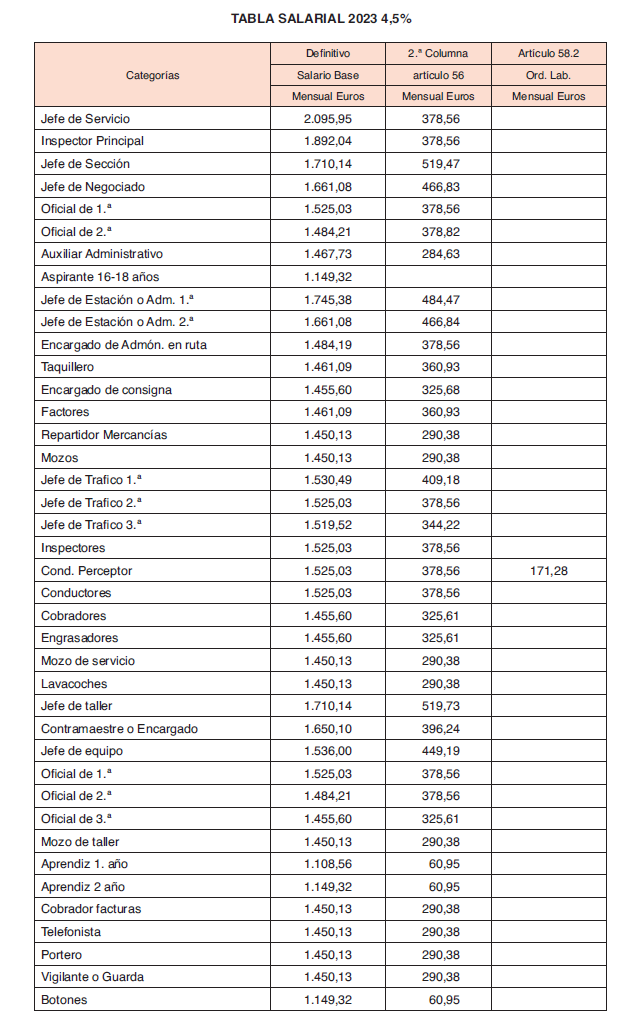 Esta segunda columna la cobrarán las categorías laborales cuya percepción será aplicada por cada empresa a los distintos conceptos que le afecten, como limpieza, conservación de vehículos, trabajo extra por liquidación de cobradores y conductores perceptores, incentivos, primas, pluses, premios, etc. siempre dentro de su categoría laboral, según la definición de categorías especificadas en la vigente Ordenanza Laboral de Transportes.