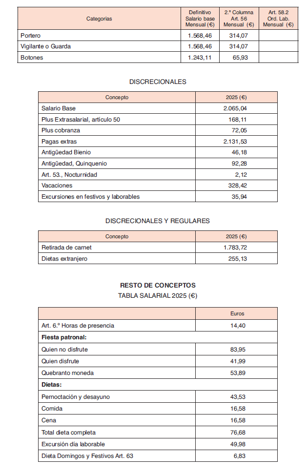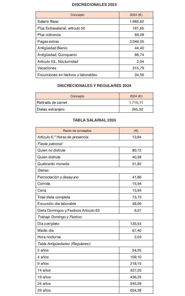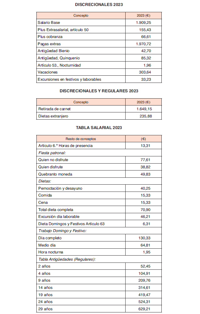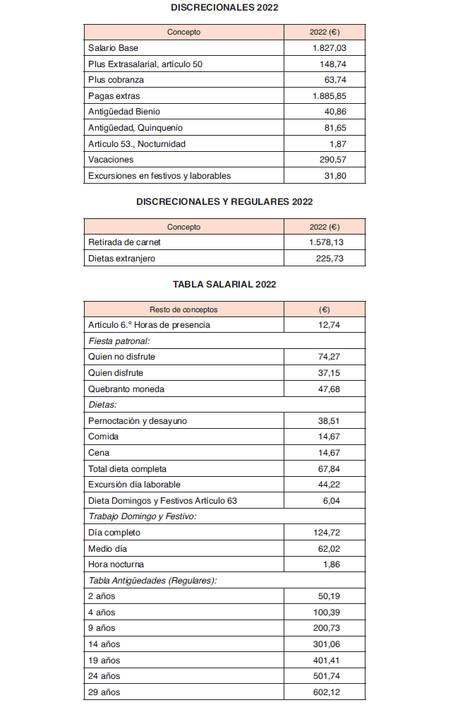 – Transportes Discrecionales: salario base, plus extrasalarial, plus cobranza y plus nocturnidad (estos 2 últimos cuando sean habituales).