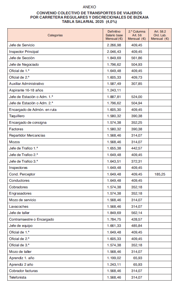 «Se aprueban las tablas salariales del Convenio Colectivo de Transportes de Viajeros por Carretera Regulares y Discrecionales de Bizkaia que, firmadas, se adjuntan como anexo a la presente acta, resultantes de la aplicación de la revisión salarial para 2025 en función de la evolución del IPC, previsto en el artículo 1 del referido Convenio, con efectos desde el 1 de enero de 2025.