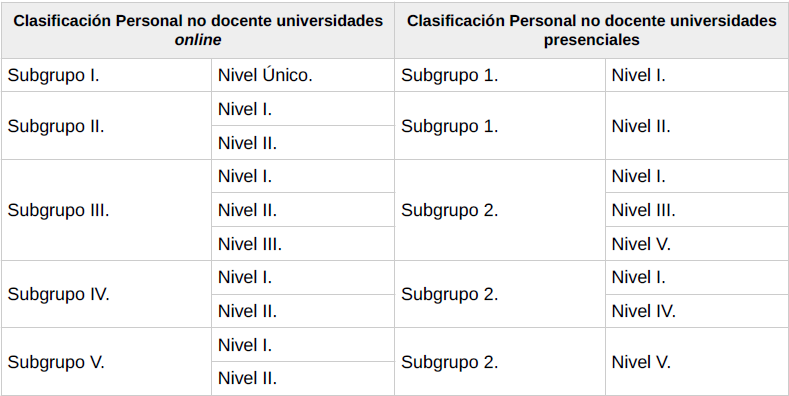 A los únicos efectos de las tablas salariales, la asimilación de la clasificación profesional del Personal no docente de universidades online y el personal no docente de universidades presenciales, se realizará conforme a la siguiente tabla:
