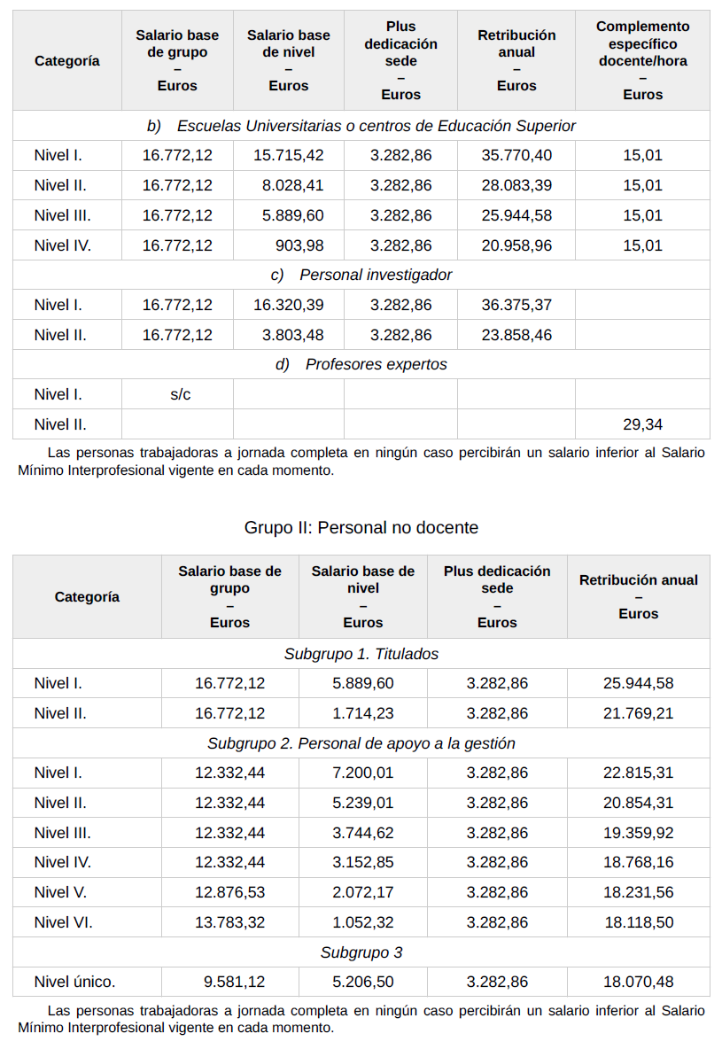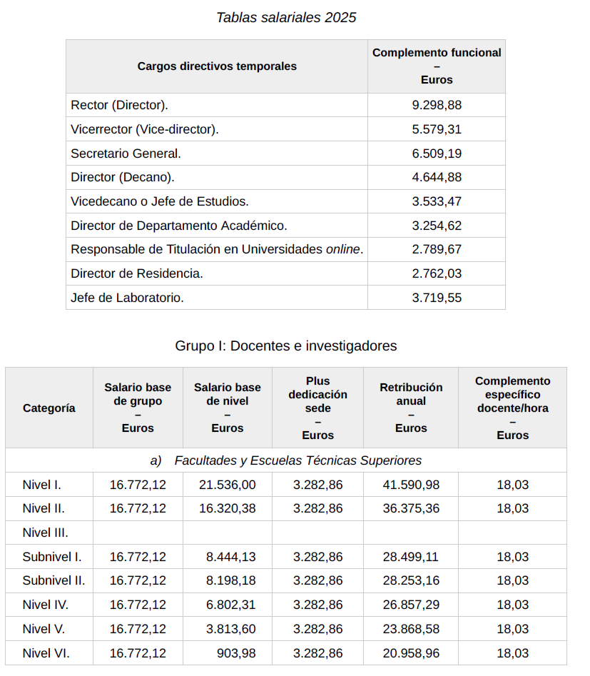 Subgrupo I. Nivel Único: pertenecen a este subgrupo y nivel los trabajadores que, por conocimiento o experiencia profesional, tienen atribuidas funciones directivas o de responsabilidad ejecutiva, vinculadas con objetivos generales de la Universidad, realizando las mismas con autonomía iniciativa y plena responsabilidad. Tienen capacidad de supervisión sobre otros trabajadores y responsabilidad a alto nivel, acordes con las funciones que tienen asignadas; habiendo sido nombrados directivos por la Universidad.