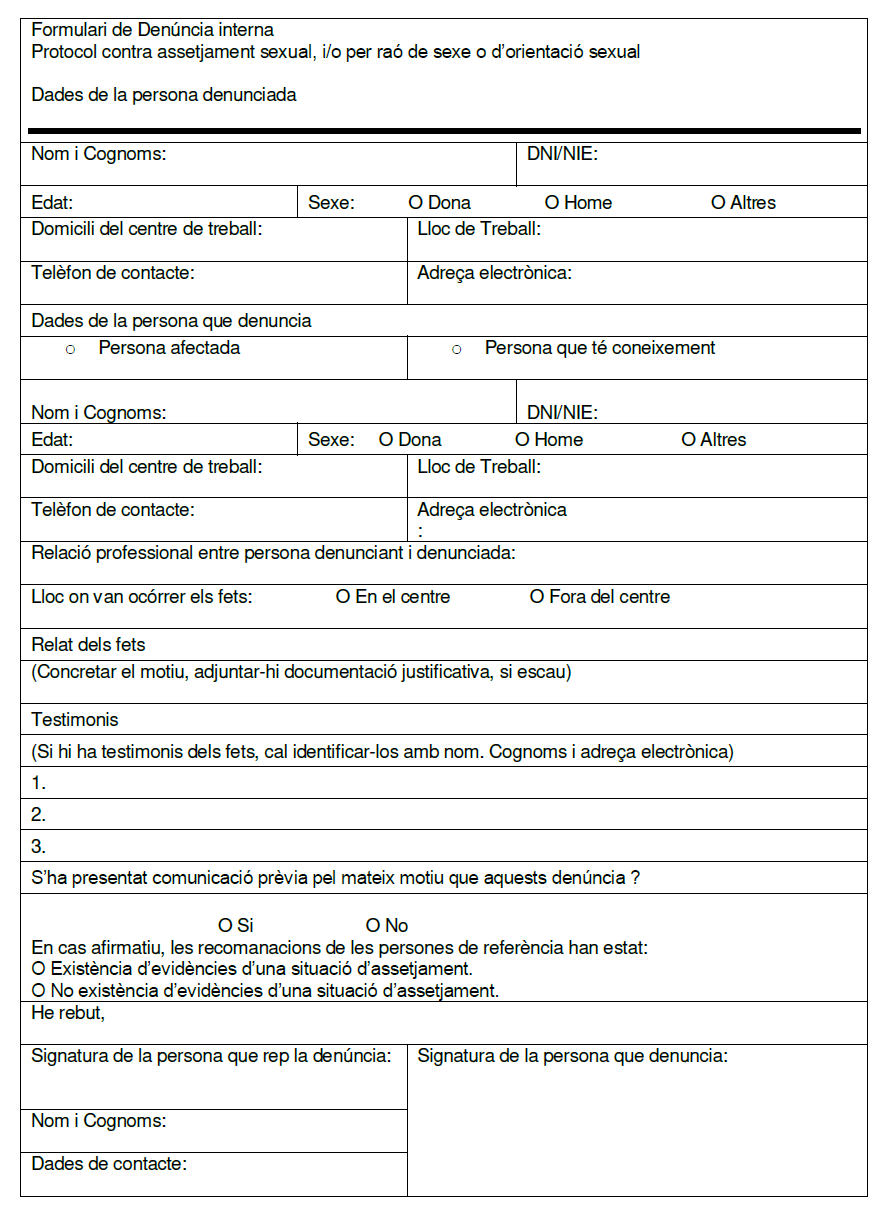 La denúncia es presenta a la persones anomenades en cada centre de treball.
