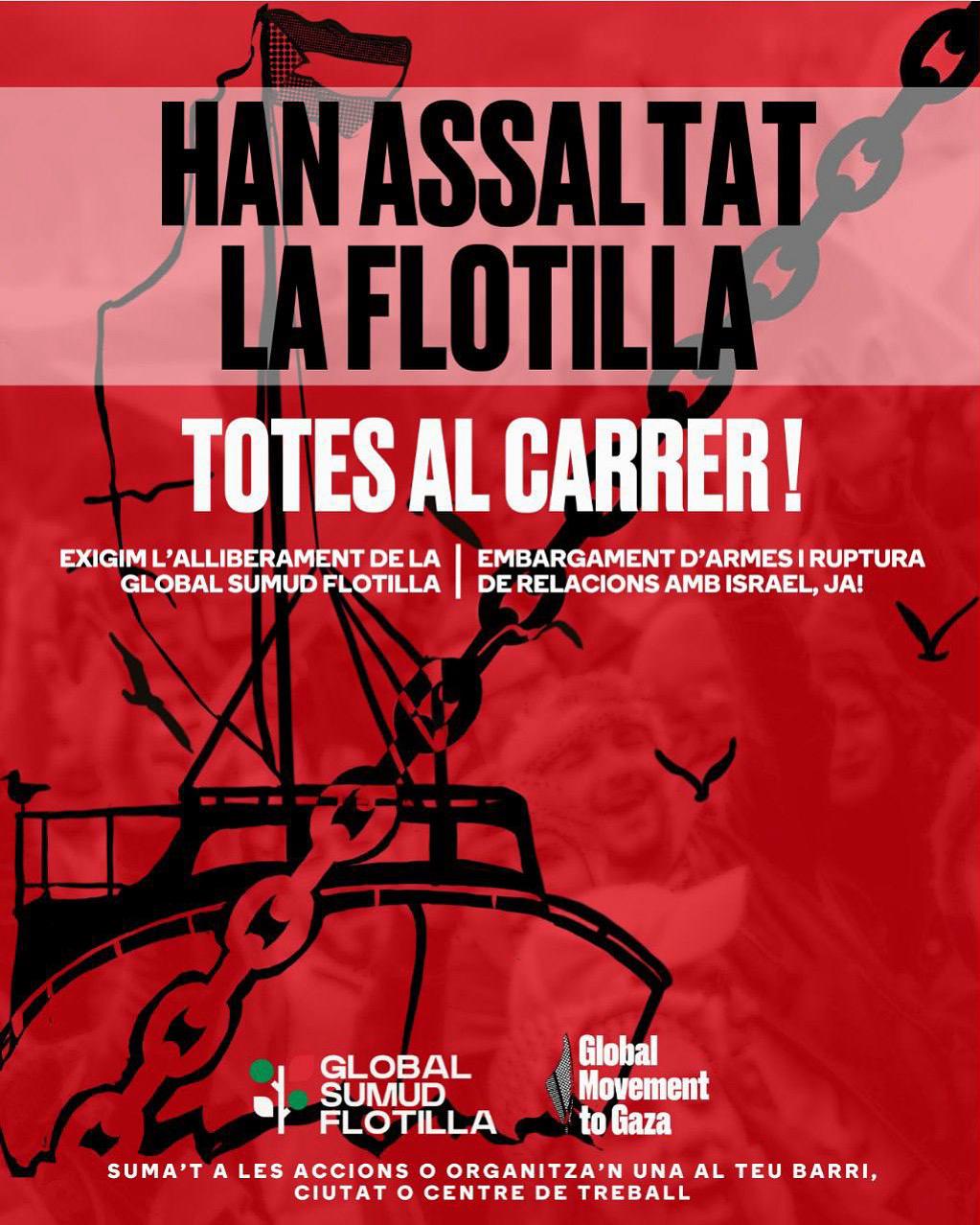 CCOO fa una crida a la participació com a mostra de rebuig a l’atac a la Flotilla a les concentracions d’avui 2 d’octubre a la tarda als diferents municipis catalans. A Barcelona, el punt de trobada és a la plaça de la Carbonera, on s’ha convocat a les 18 h una concentració. A Girona, la crida és a les 19 h davant l’Ajuntament. També a altres localitats s’estan convocant mobilitzacions a les portes dels Consistoris.