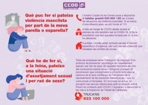 Totes les empreses tenen l’obligació de disposar d’un protocol de prevenció i abordatge de l’assetjament sexual i per raó de sexe. En aquests moments de crisi del coronavirus també tenen l’obligació d’actuar. Et recomanem que comparteixis la situació amb alguna persona de la teva confiança de l’empresa i de la representació de les persones treballadores, i que ho comuniquis a l’empresa. Si l’empresa no actua, no acceptis cap excusa relacionada amb la situació actual. Posa’t en contacte amb CCOO i t’ajudarem a denunciar el teu cas a la Inspecció de Treball de Catalunya.