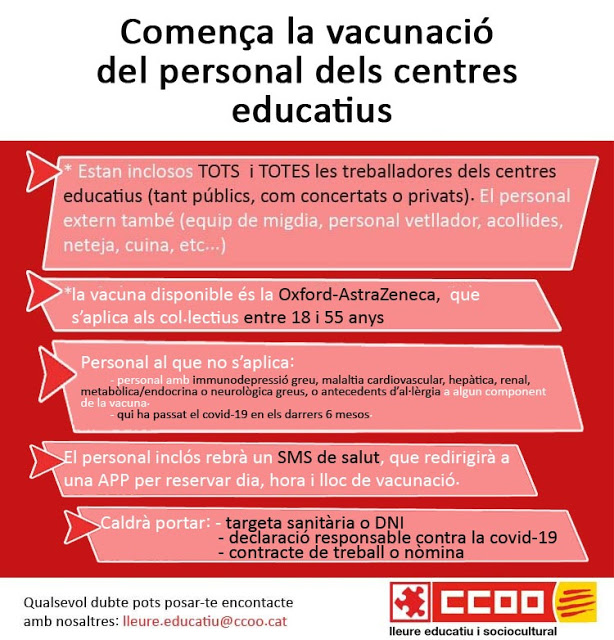 La Generalitat ha començat una campanya per vacunar a tot el personal que treballa en els centres escolars. Aquesta campanya inclou al personal del sector del #LleureEducatiu com ara monitores de menjador, vetlladores i suport educatiu.