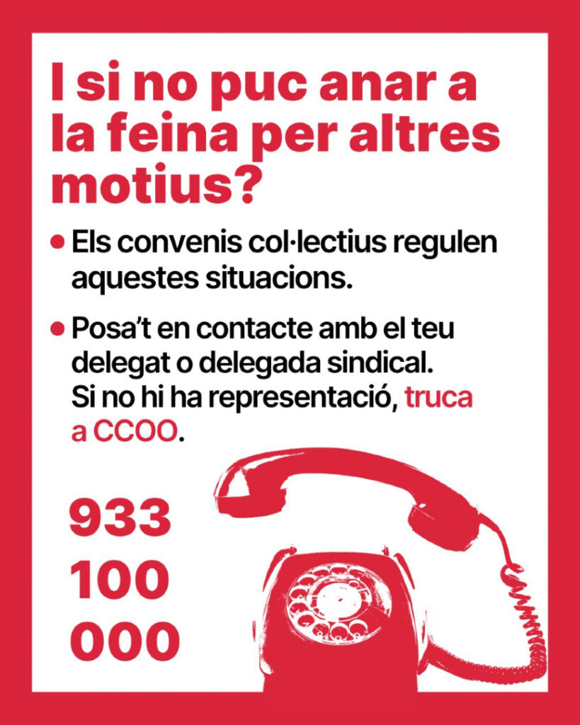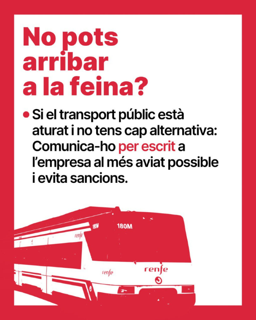 Si t’és impossible desplaçar-te per manca de transport públic i privat, comunica per escrit com més aviat millor aquesta situació a l’empresa, per evitar possibles sancions per absència. Fes també aquesta comunicació si no pots arribar a la feina a la teva hora per culpa dels problemes per desplaçar-te.