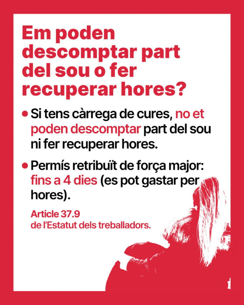 Si la falta a la feina és per motius familiars de força major (quedar-me amb la canalla o amb persones dependents, per manca de serveis escolars o d’atenció a la dependència, o per manca de transport per acompanyar-los allí) tens les hores de permisos retribuïts equivalents a 4 dies i no et poden descomptar salaris ni fer-te recuperar les hores. Art. 37.9 de l’Estatut dels Treballadors.