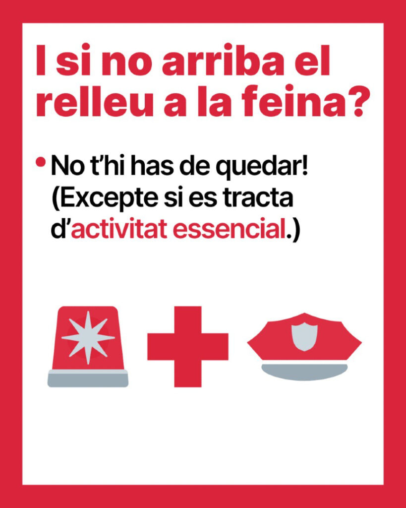 No has de romandre a la feina si no arriba el relleu, excepte en el cas que es tracti d’una activitat essencial o en el cas que finalitzar la teva feina sense relleu pugui suposar una situació de pèrdua de seguretat per a les persones o les instal·lacions (per exemple, hospitals o centrals nuclears).