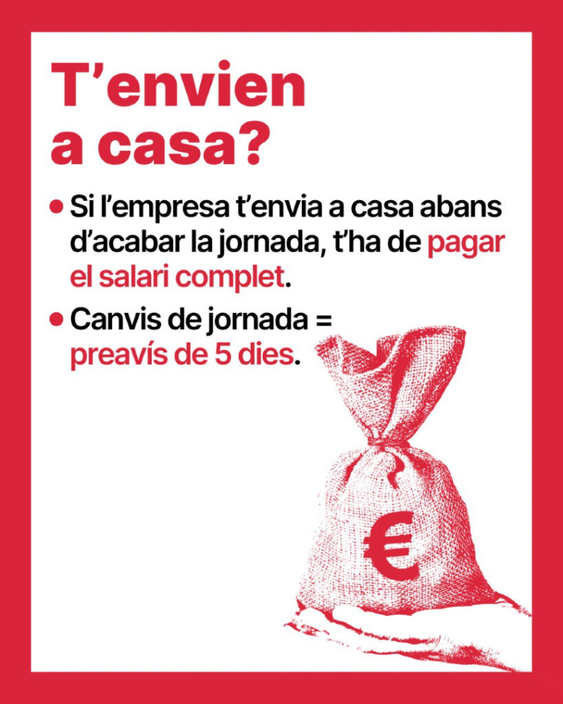 Si t’envien a casa sense haver finalitzat la teva jornada diària, l’empresa ha d’assumir el salari de les hores deixades de realitzar. Per acudir a la flexibilitat de la jornada de treball, l’empresa ha de fer-ho amb un preavís de 5 dies, segons l’article 34.2 de l’Estatut dels Treballadors.