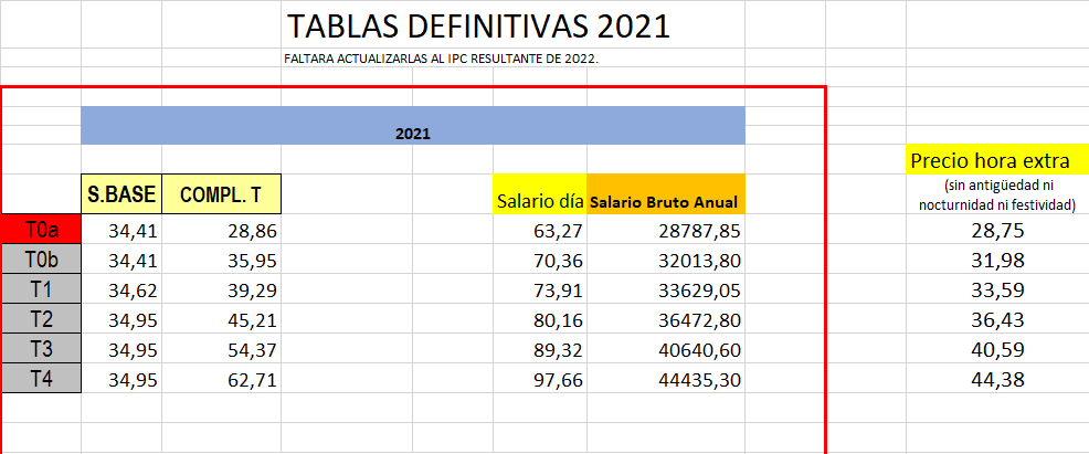 Tablas salariales hourly definitivas de 2021, y provisionales de 2022 ya qu eestán pendientes de aplicarles el IPC de 2022.