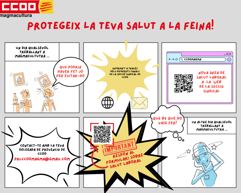 Benvingut/da a la secció de salut laboral de CCOO Magmacultura. Creiem que la prevenció i les mesures que l’empresa ha de implementar per protegir la salut dels treballadors i treballadores és molt important. En qualsevol cas la nostra secció sindical atendrà qualsevol dubte relacionat amb la salut laboral mitjançat aquest correu electrònic: