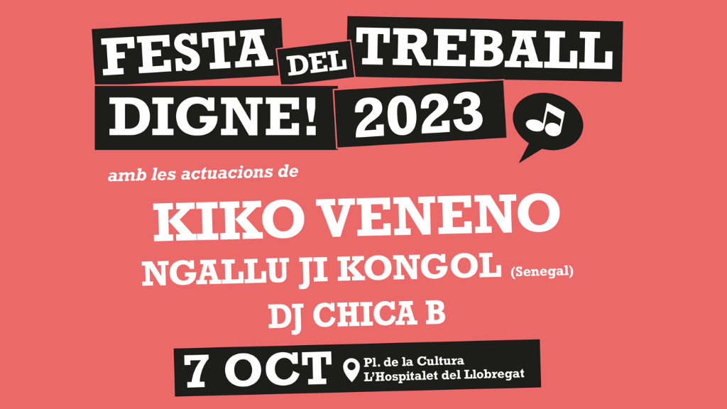 Un any més, el proper 7 d’octubre, CCOO de Catalunya celebrarem la Festa del Treball Digne 2023 a la plaça de la Cultura de l’Hospitalet de Llobregat.