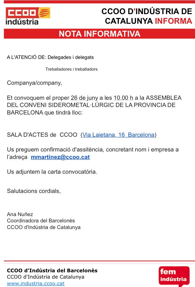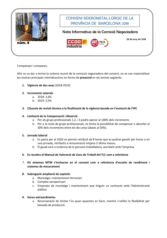 CONVENI SIDEROMETAL·LÚRGIC DE LA PROVÍNCIA DE BARCELONA 2018-2019 (CATALÀ) CONVENIO SIDEROMETALÚRGICO PROVINCIA DE BARCELONA (CASTELLANO) TAULES SALARIALS 2018 TAULES SALARIALS 2019